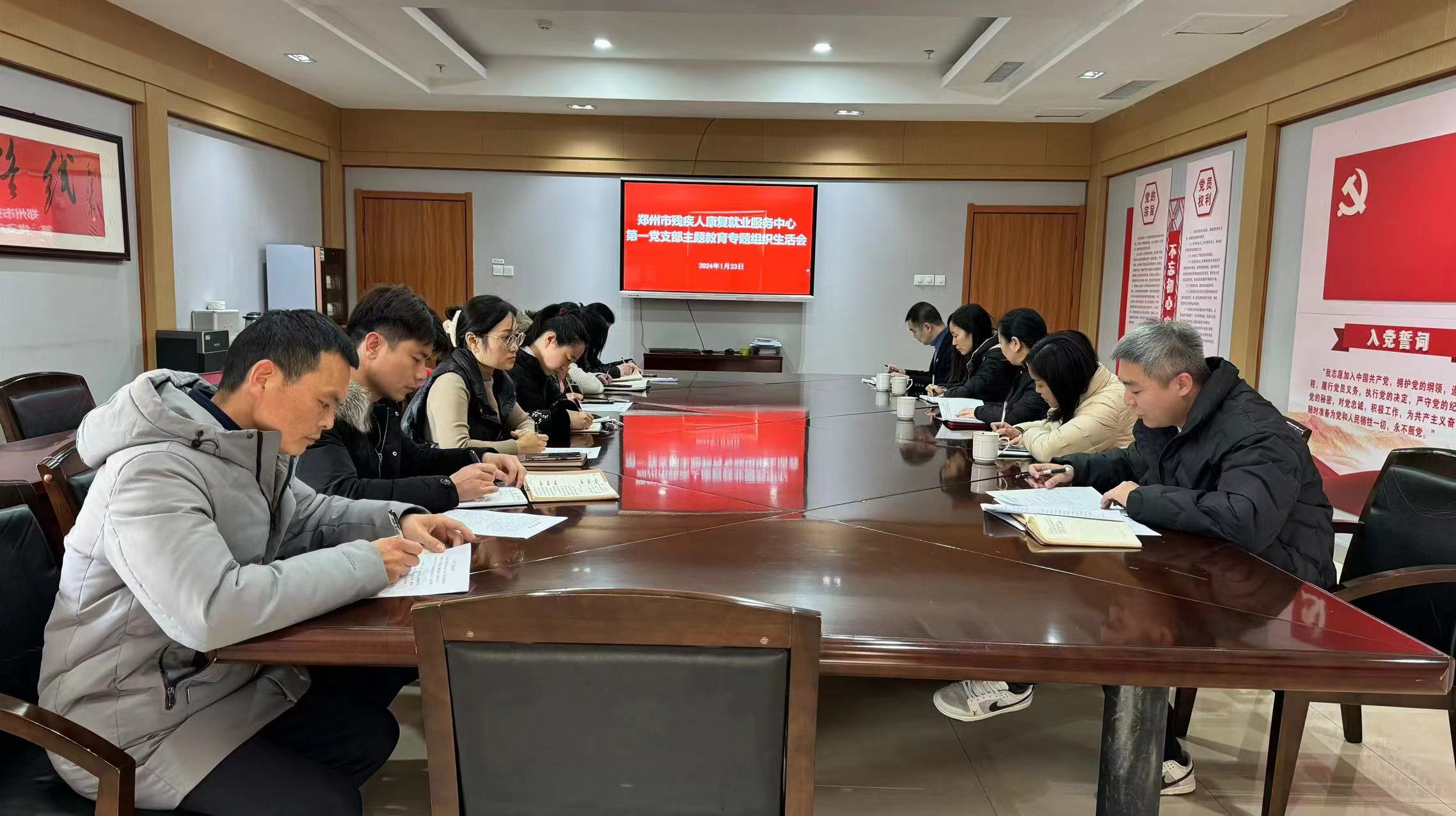 2024年1月23日下午,郑州市残疾人康复就业服务中心第一党支部召开学习贯彻习近平新时代中国特色社会主义思想专题组织生活会。中心一支部书记于斐主持会议,市残联党组成员、副理事长张春萍,人事部部长高涵、人事部副部长李燕宁参加会议。