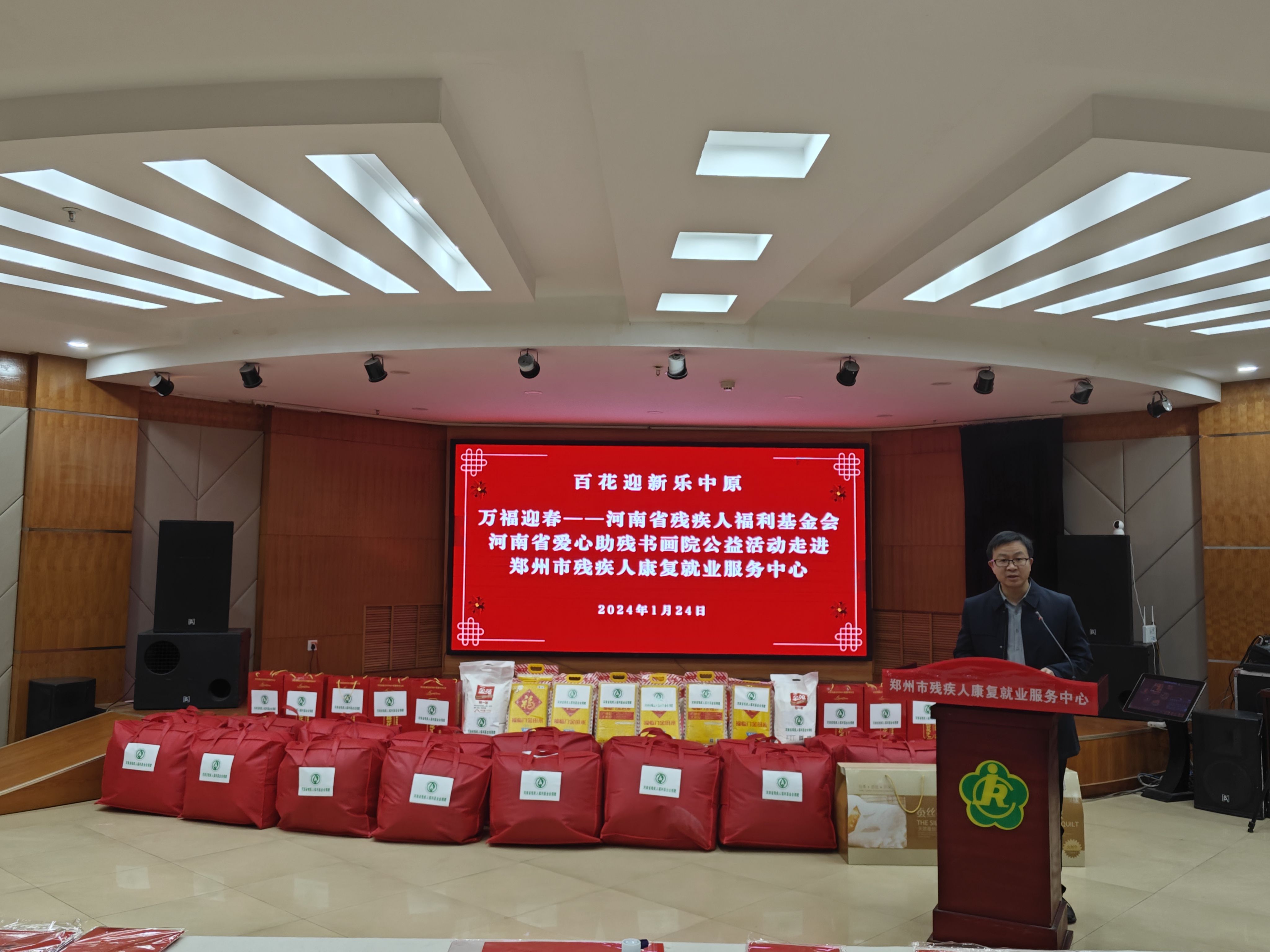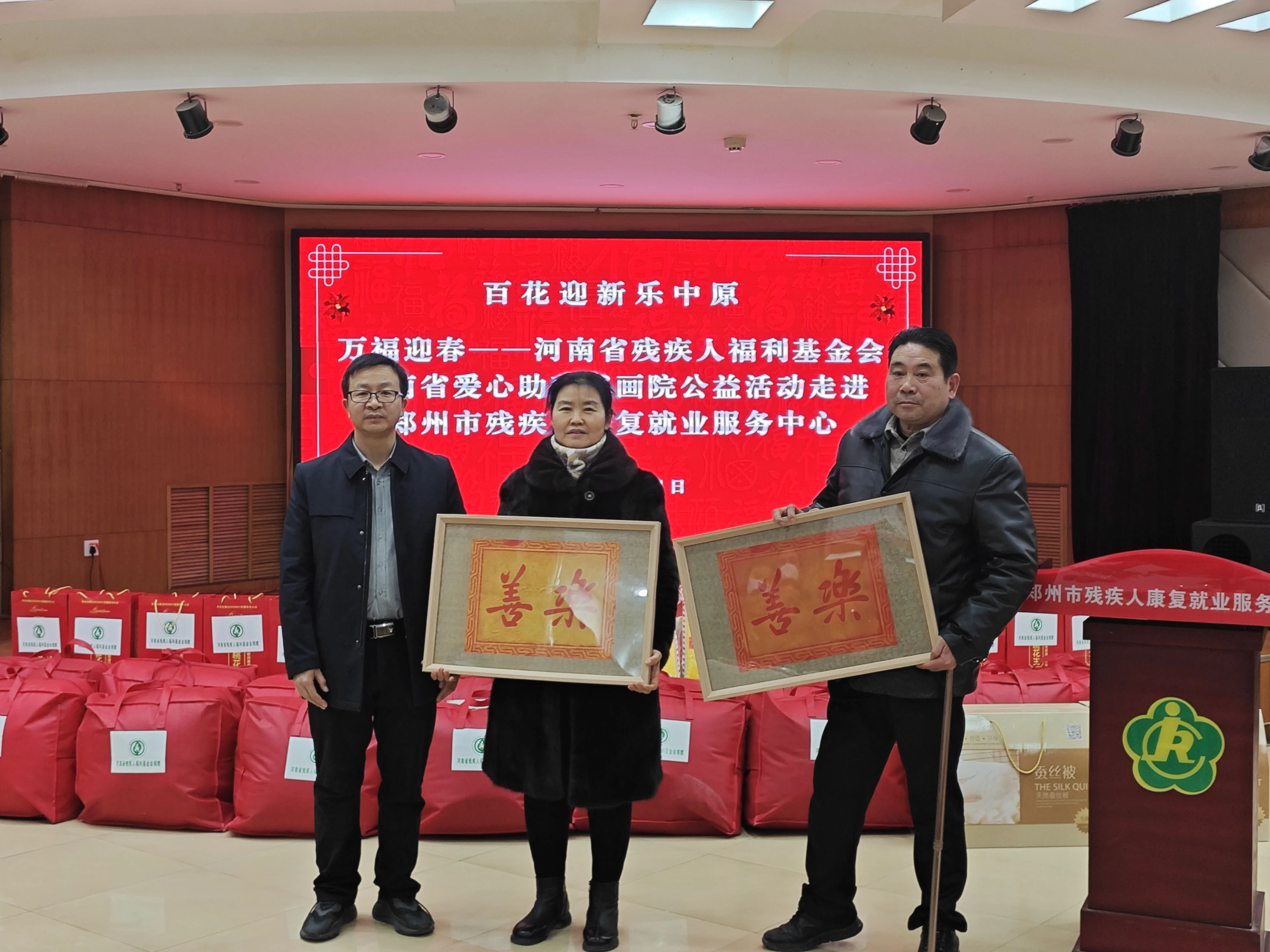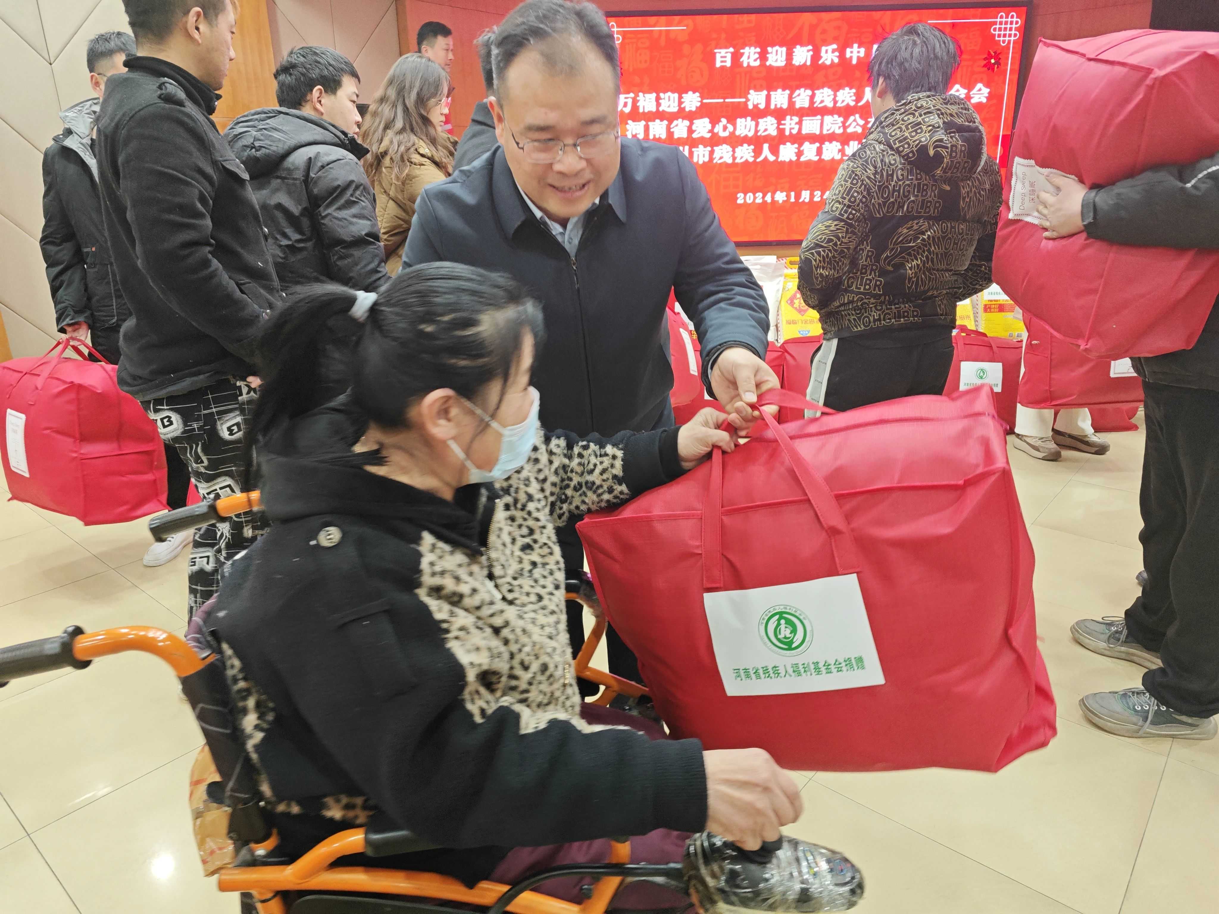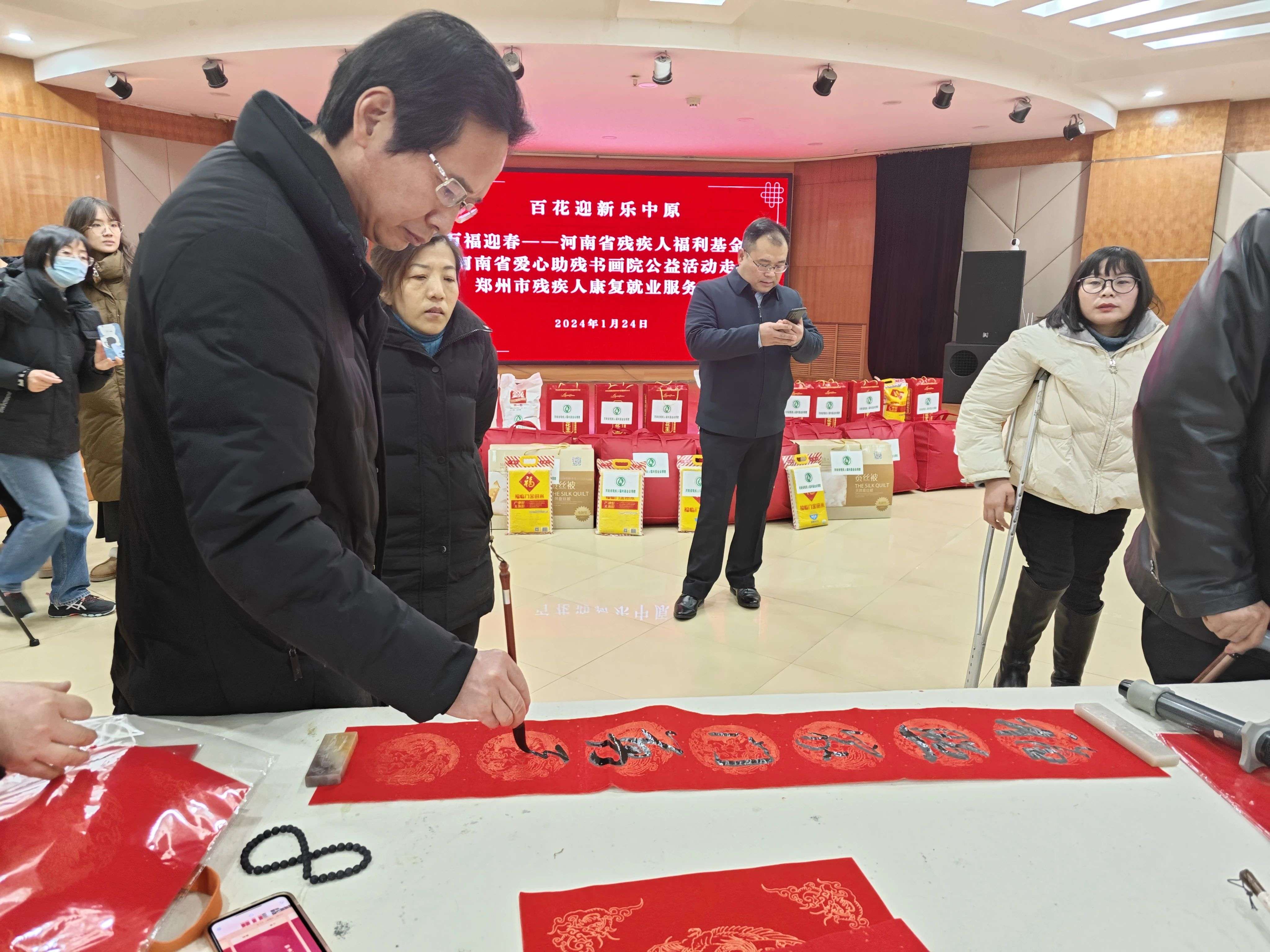 龙年春节将至,为了丰富残疾人朋友的精神文化生活,营造祥和、喜庆的节日氛围。1月24日上午,河南省残疾人福利基金会理事张来忠、河南省爱心助残书画院院长楚永堂、郑州经开区康教残疾人就业创业互助中心书记湛松菊带领爱心艺术家近二十余人,组织开展“迎新春、送温暖、写春联”活动。