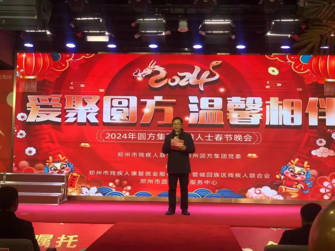 数九寒天人心暖,一家欢聚情意浓。为进一步弘扬民族文化,丰富残疾人的精神文化生活,营造浓厚的节日氛围,让残疾人感受“家”的温馨。2月5日下午,2024“爱聚圆方 温馨相伴”残疾人春节晚会在圆方集团举行,晚会由郑州市残疾人联合会、郑州圆方集团党委主办,郑州市残疾人康复就业服务中心、管城回族区残疾人联合会、郑州市圆方社工服务中心承办。近三百名残疾人参加演出。河南省残联教育就业部部长郑咏民、郑州市残联党组成员二级调研员董付行、副理事长吴志超、杨叶青、管城区残联就业办主任马悦、圆方集团专职党委副书记刘新旺等出席本次活动。