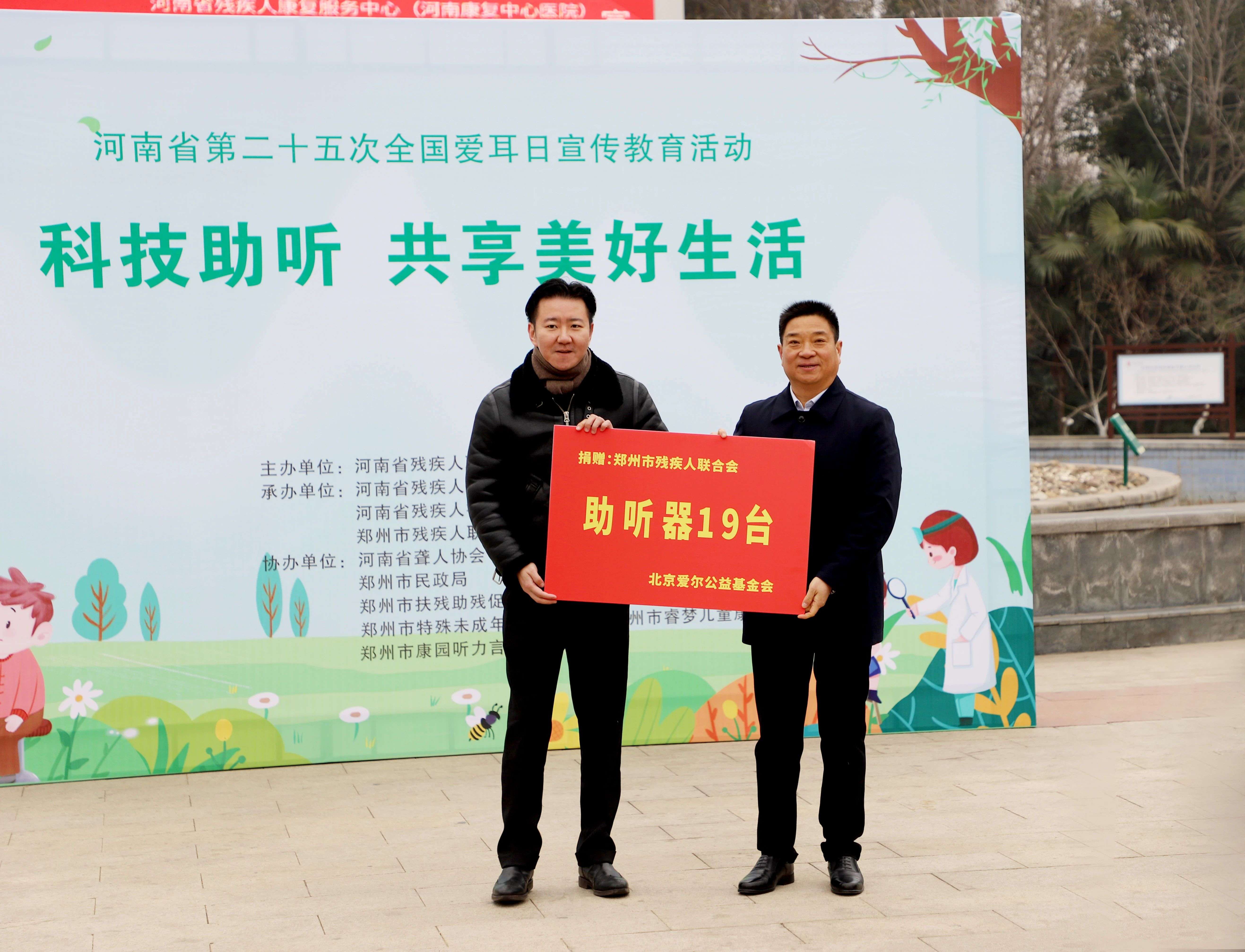 活动现场,河南省残疾人福利基金会捐出700台助听器和8台人工耳蜗,赠予安阳、鹤壁、新乡、焦作、商丘、周口市残联、河南省人民医院、郑州大学第一附属医院、郑州市扶残助残促进会等单位;北京爱尔公益基金会向郑州市残联捐赠19台助听器;郑州市残联和市扶残助残促进会现场将100台助听器分发给了金水区、惠济区、郑东新区残联和经开区九龙办事处等单位的代表。