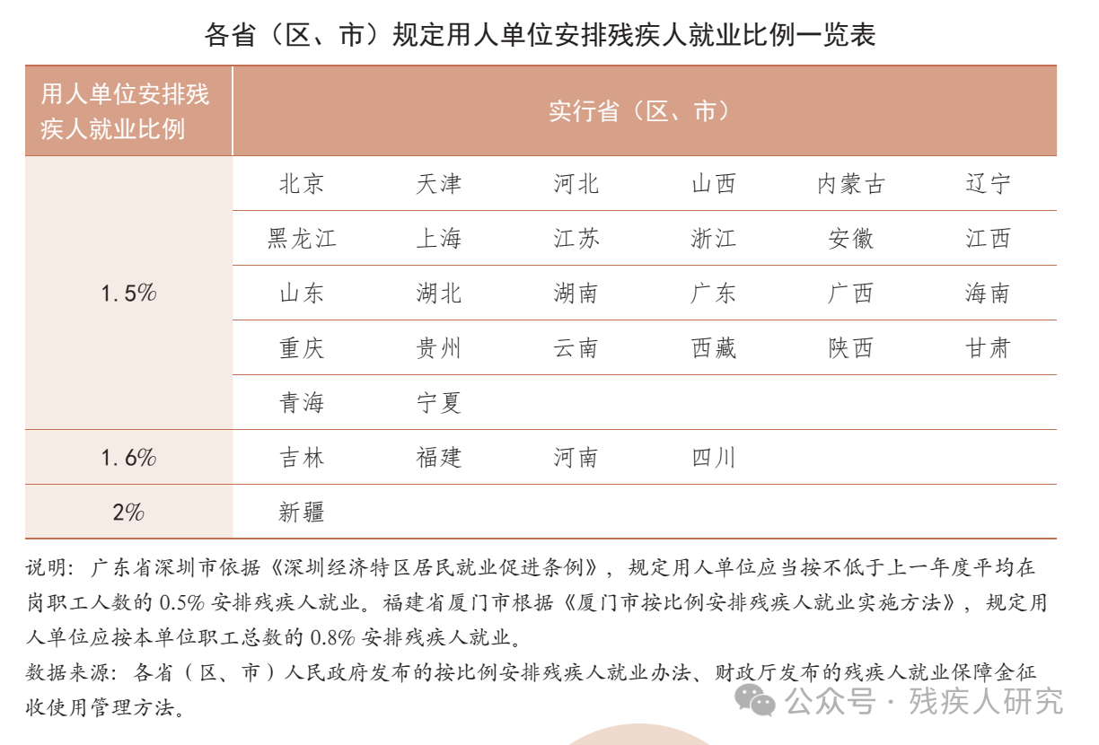 各省(区、市)规定用人单位安排残疾人就业比例一览表