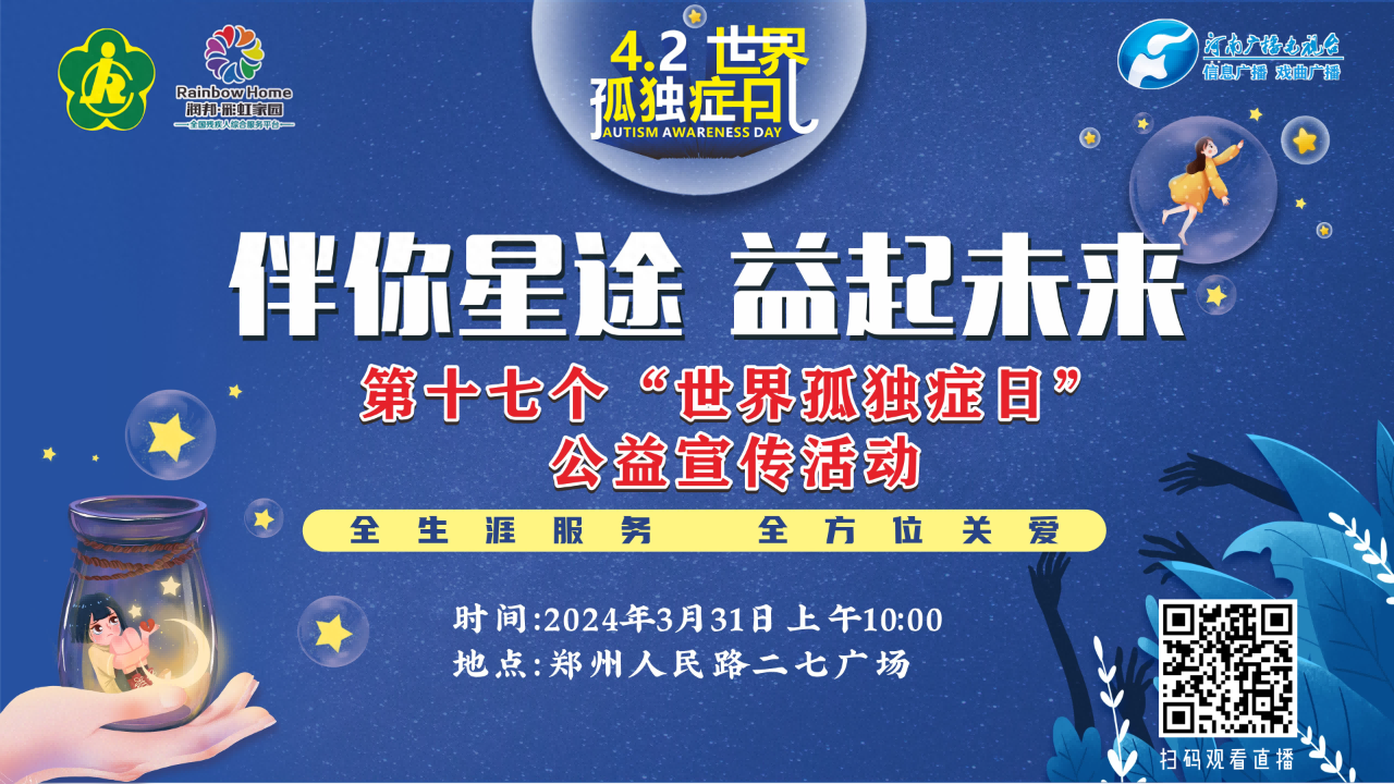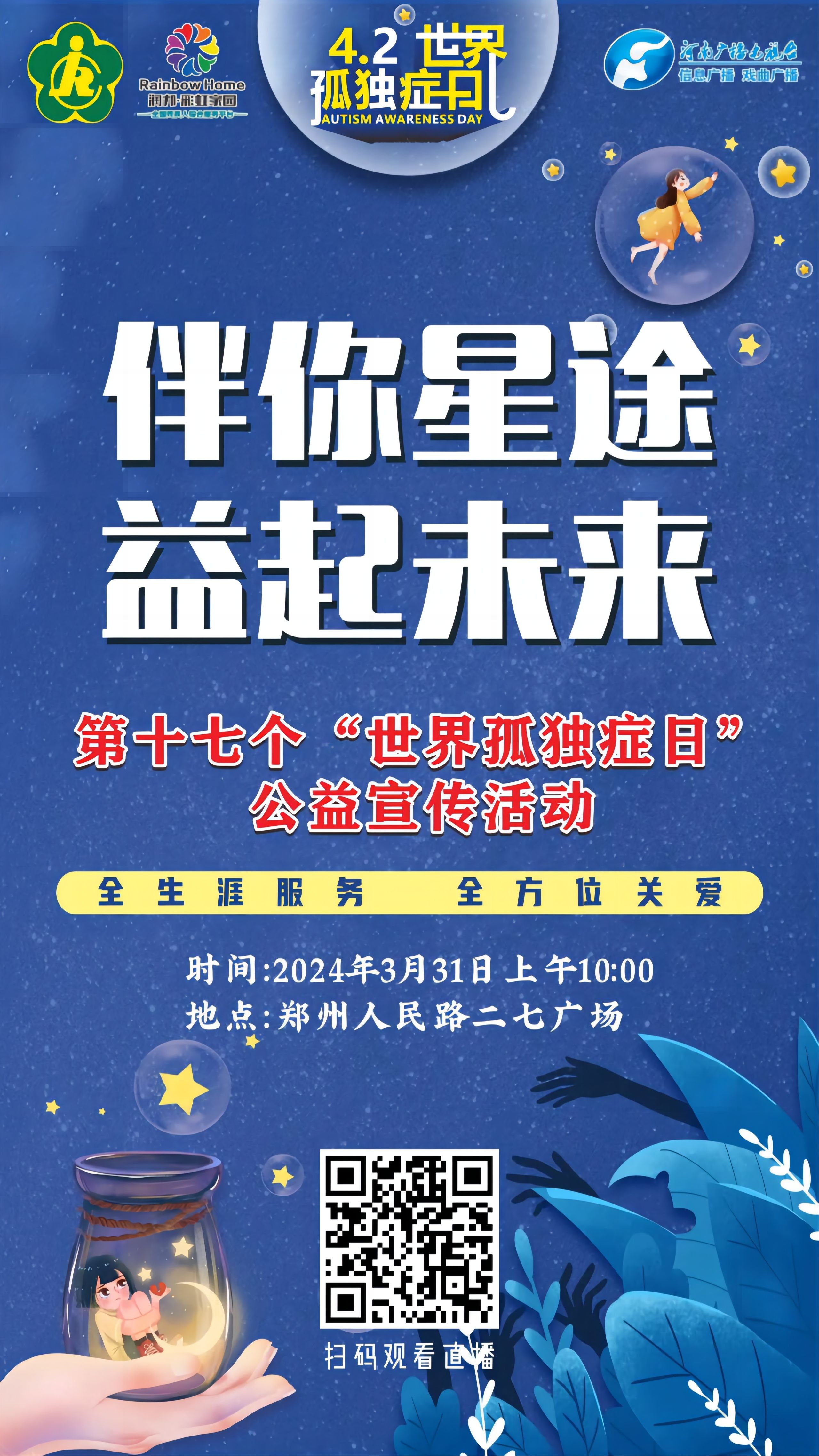 2024年4月2日是第十七届世界孤独症日,宣传主题口号是:“全生涯服务,全方位关爱”。在第十七个世界孤独症日前夕,由河南省残联、河南省残疾人康复服务中心主办,河南广播电视台生活事业部、《豫·爱共享》栏目等协办的“伴你星途,益起未来”孤独症日公益宣传活动,将于本周日3月31日上午十点,在河南省郑州市二七广场举行。现场将举行快闪表演、文艺演出、慈善义卖、义诊咨询、手工制作等丰富多彩的活动邀您参与。同时该场活动也将在大象新闻客户端同步直播,参与互动评论还将有机会获得奖品!