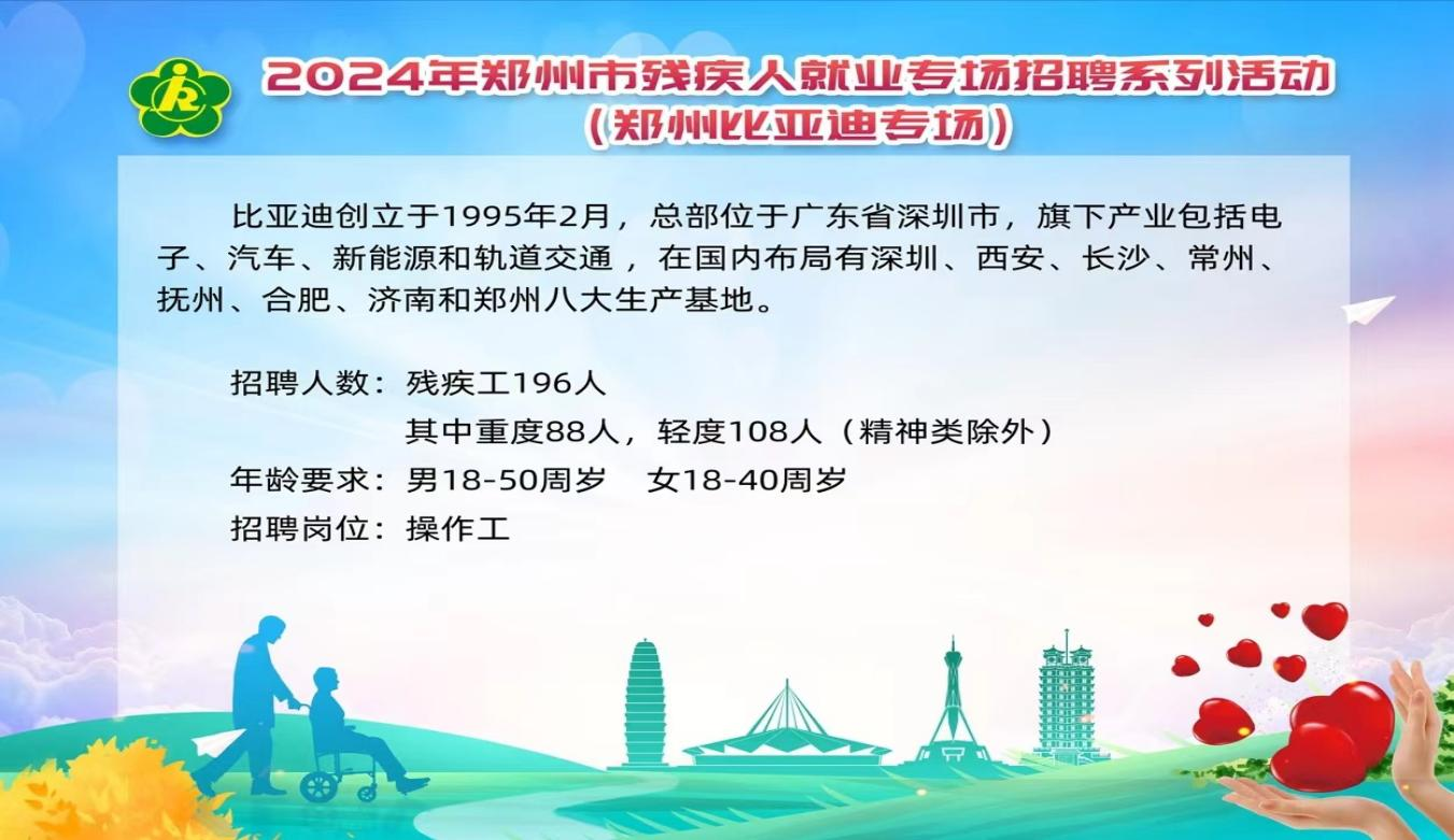 2024年郑州市残疾人就业专场招聘系列活动(郑州比亚迪专场)开始了