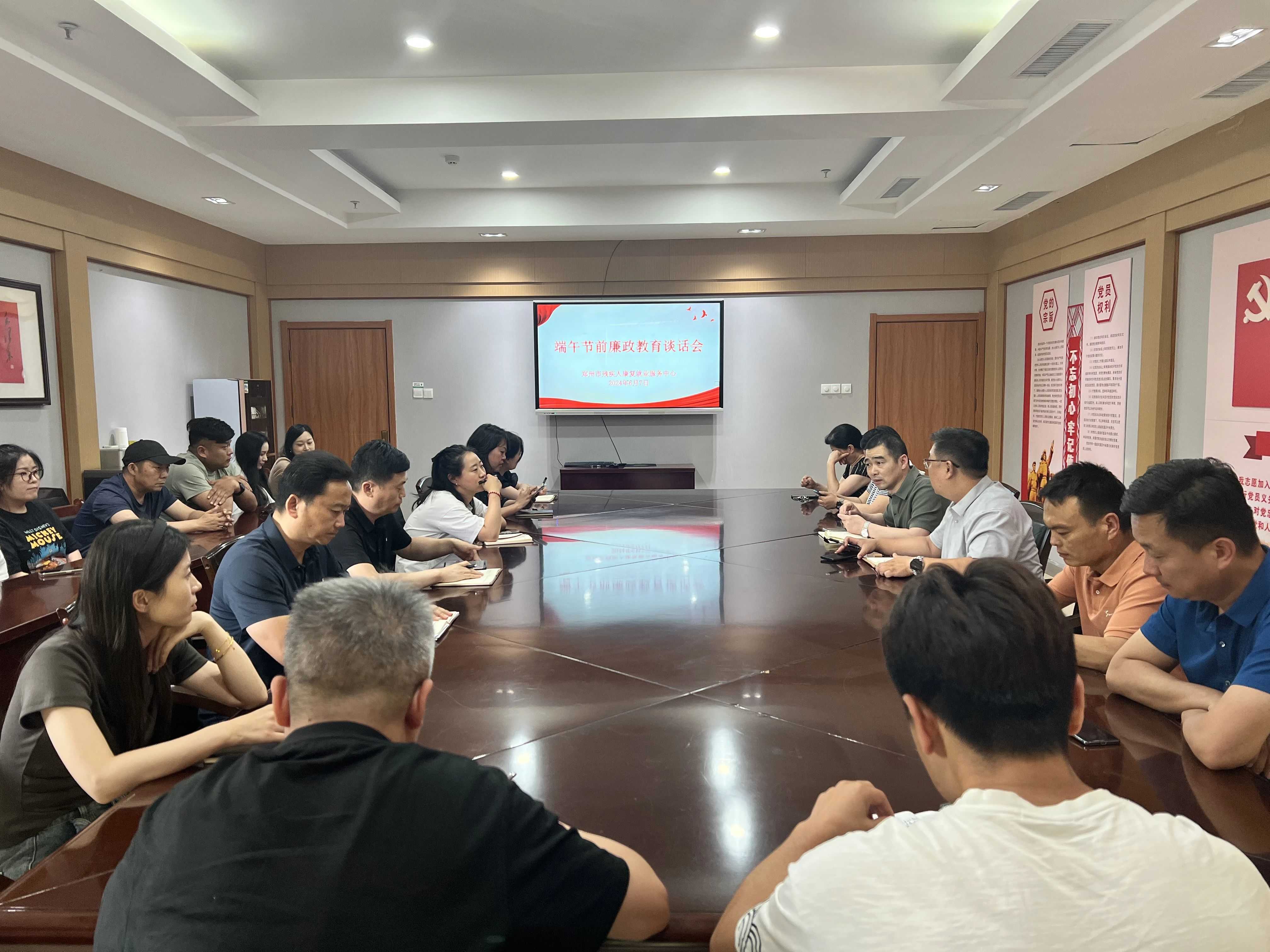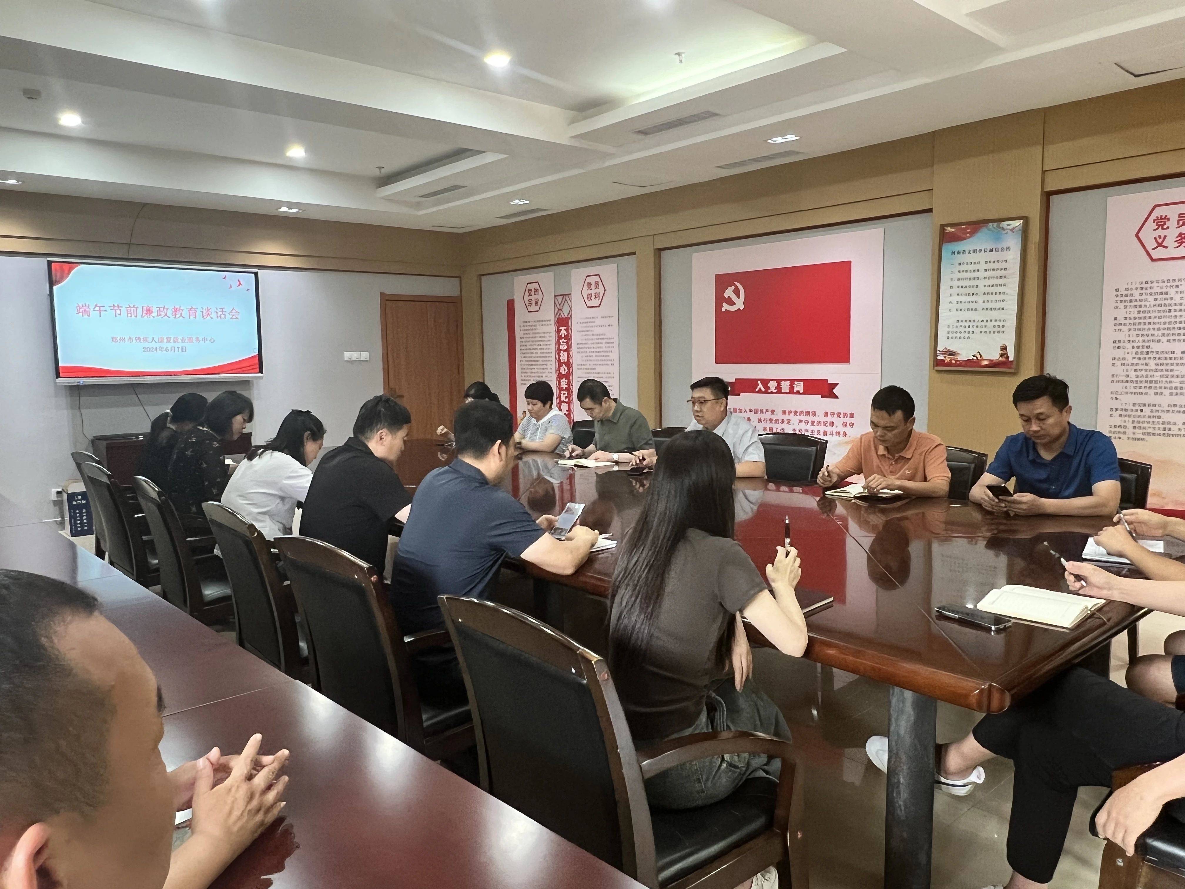 随着端午节的临近,2024年6月7日下午郑州市残疾人康复就业服务中心举办了一场廉政教育谈话会,对党风廉政建设和安全生产等工作进行了安排部署,全体干部职工参加会议。此次会议旨在深入贯彻全面从严治党要求,严格落实中央八项规定精神,提高全体职工的廉洁意识,筑牢廉洁自律思想防线。