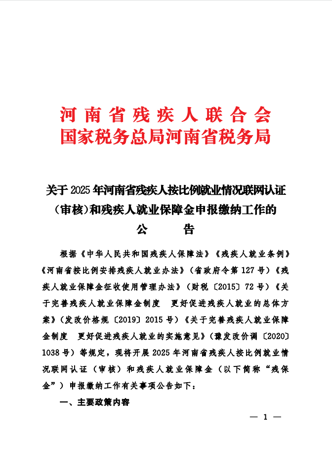 关于2025年河南省残疾人按比例就业情况联网认证(审核)和残疾人就业保障金申报缴纳工作的公告