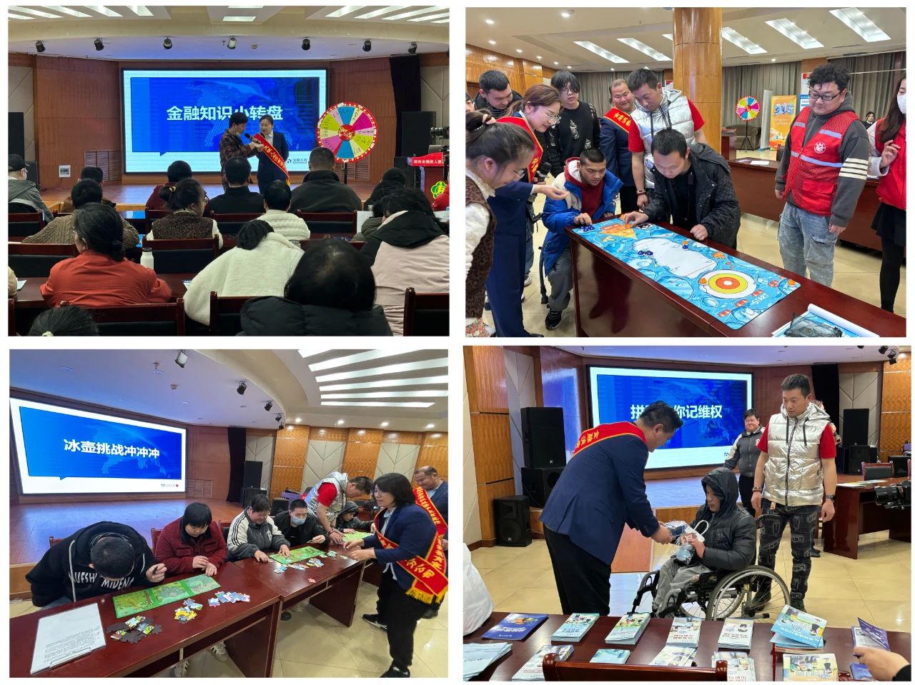 为了让金融知识更好地被理解和吸收,活动精心设计了30分钟的趣味游戏环节。“金融知识小转盘”选取8名学员参与,通过转动转盘随机选定金融消费者八大权益之一,主持人结合生动案例进行讲解;“冰壶挑战冲冲冲”则邀请6名学员,在桌面冰壶游戏中,当冰壶被推至相应诈骗手段区间时,志愿者便详细讲解反诈技巧;“拼图助你记维权”环节,6名学员在完成拼图后,解锁维权途径提问,志愿者耐心解答,现场互动频繁,欢声笑语不断。期间来自明湖办事处中烟社区的志愿者们积极配合,完成场地布置、人员组织工作,保障了活动期间的秩序。