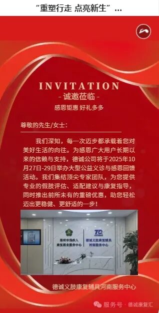 为切实帮助残疾人朋友改善行走功能、提升生活质量,郑州市残疾人康复就业服务中心联合河南德诚义肢康复,将于10月27日-29日举办“重塑行走 点亮新生”公益义诊暨感恩盛典活动,为有需求的群体搭建专业康复助力平台,提供假肢评估、适配建议、康复指导等专业服务。