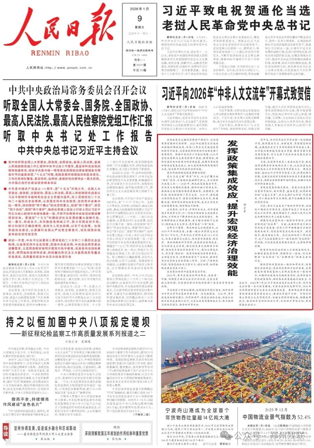 1月9日,人民日报头版重要位置刊发第三篇署名“钟才平”的文章,题目是《发挥政策集成效应,提升宏观经济治理效能》。