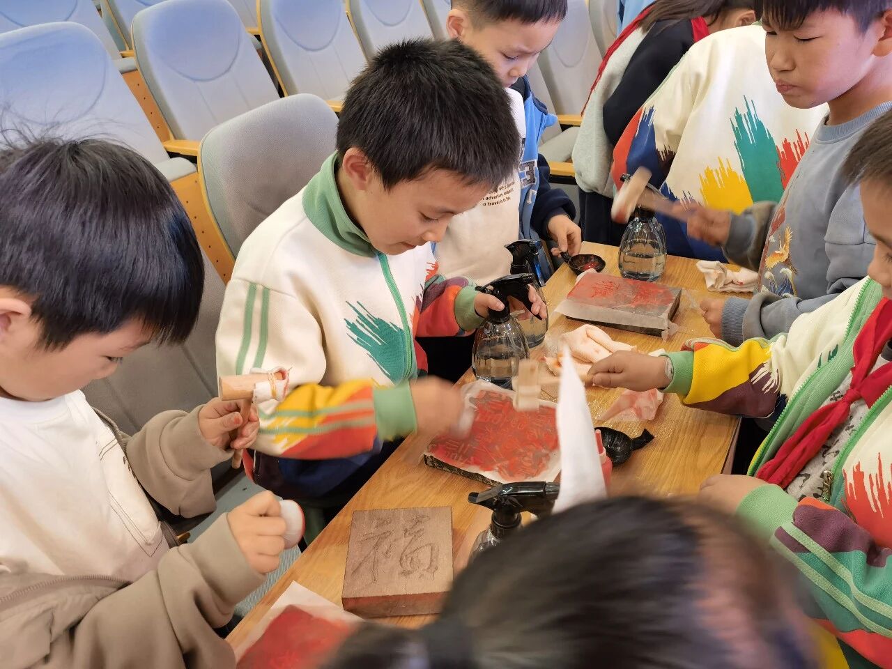 活动中,非遗传承人冯万朋详细讲解了金石传拓的历史渊源、文化内涵与工具用法,并现场示范清洁、上纸、润湿、捶平、上墨、揭取等完整技艺流程。在志愿者一对一陪同指导下,同学们有序动手体验,顺利完成了专属拓印作品,在实践中锻炼了专注力与动手能力,从中感受非遗技艺的独特魅力。